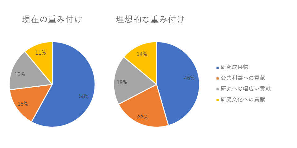 理想的には研究成果物の比重を58%から46%まで下げ、その他の貢献とのバランスをとりたいと考えている人が多いことがわかりました。主に論文を元にした評価ではサイクルの短い研究ほど有利になりやすく、研究評価における成果物への偏重は、研究の多様性を失うことに繋がります。