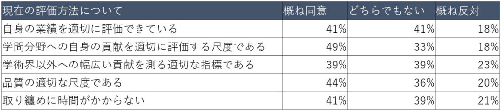 その一方、現在の方法が研究成果を適切に評価できているか、という質問に対してはいずれの項目も約4割が賛成、約4割がどちらでもない、残りの2割が反対という結果になりました。